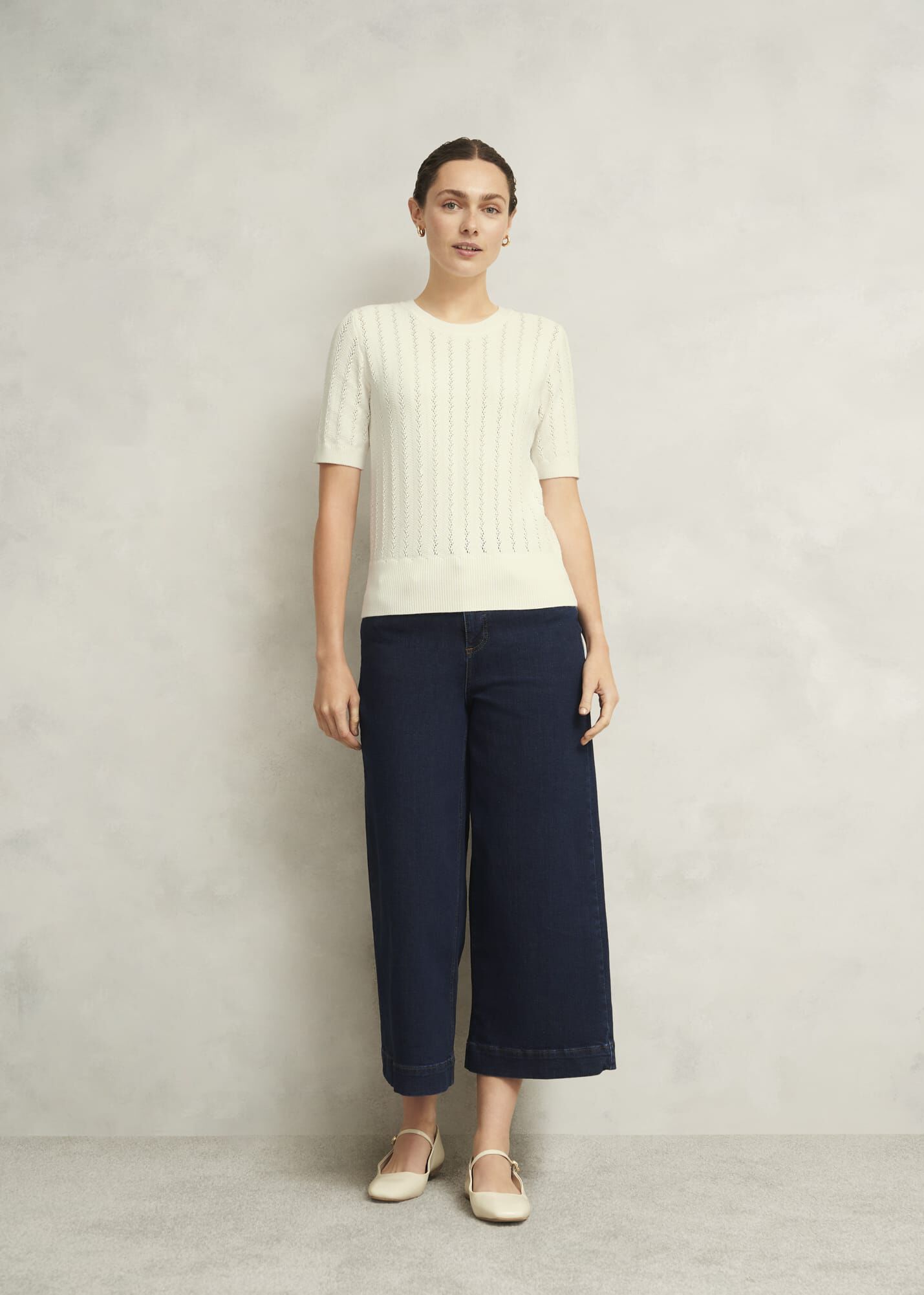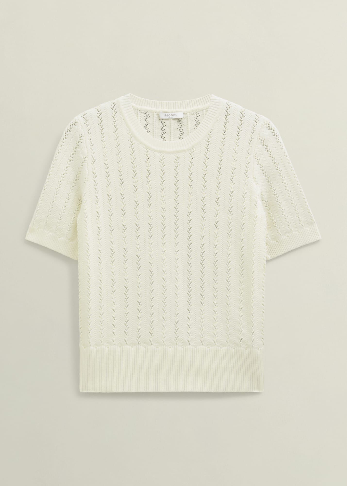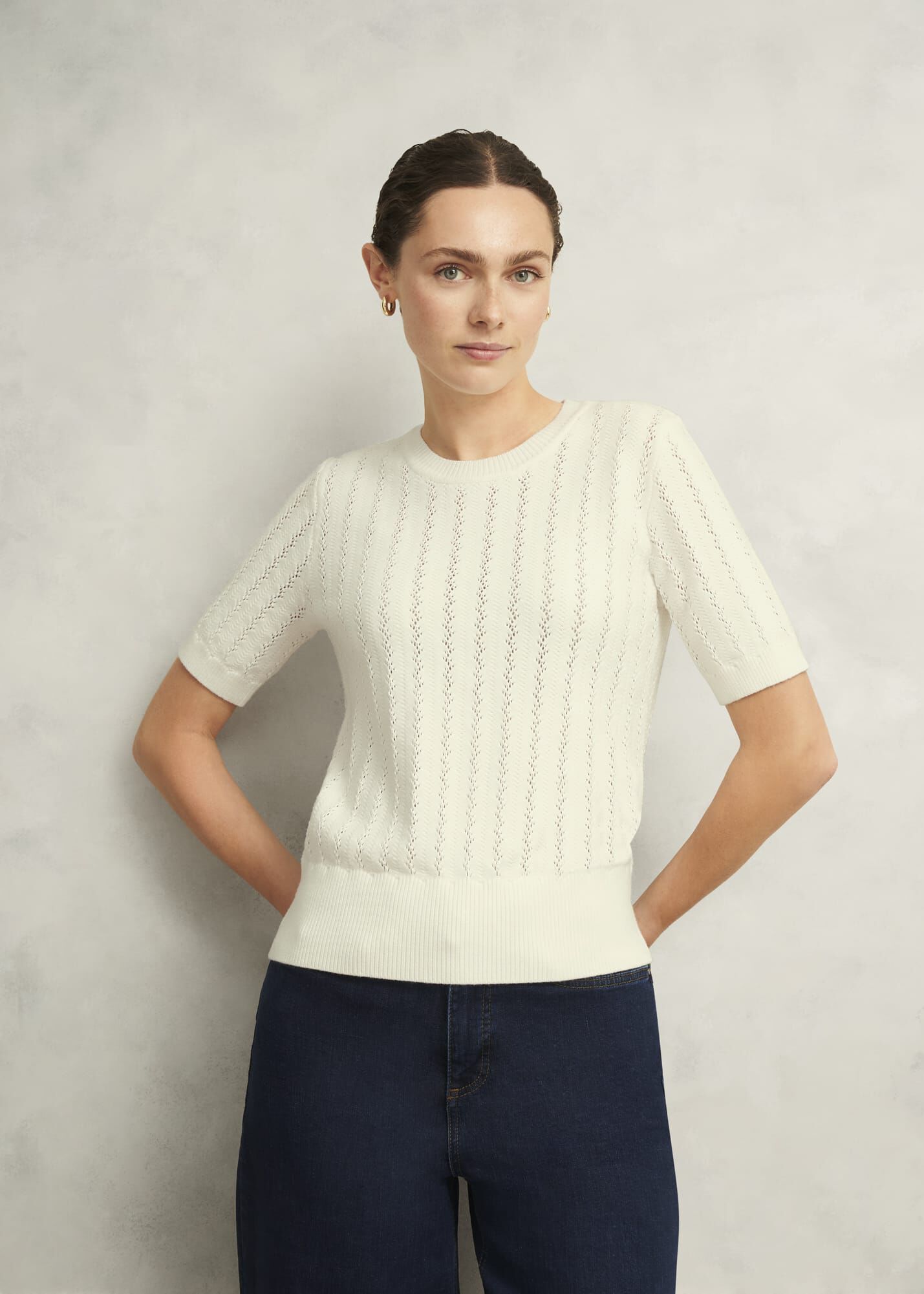 Lending itself as an essential layer to every season, the Calla top modernises your knitwear edit with pointelle stitching over a short sleeve silhouette.
