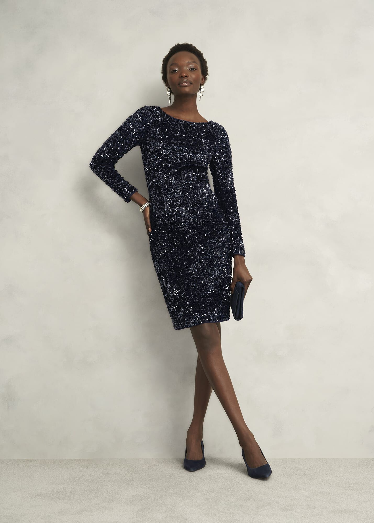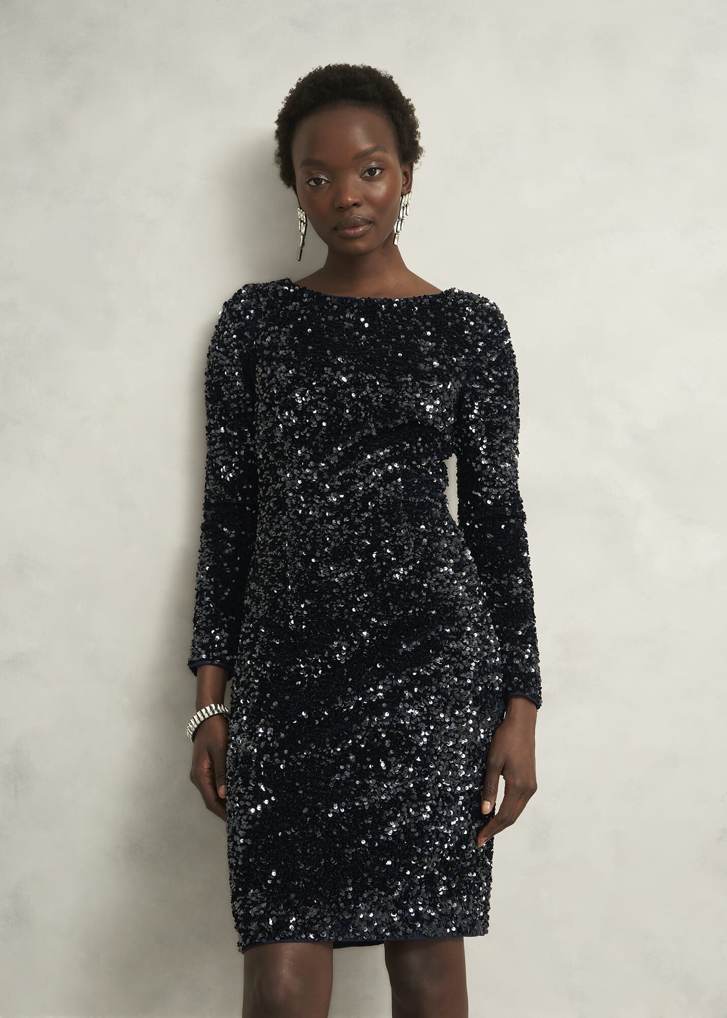 Cue party season in light-catching sequins with the Sawyer dress. Expertly cut to fit and flatter, look to the boat neckline and dipped back for alluring details.