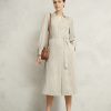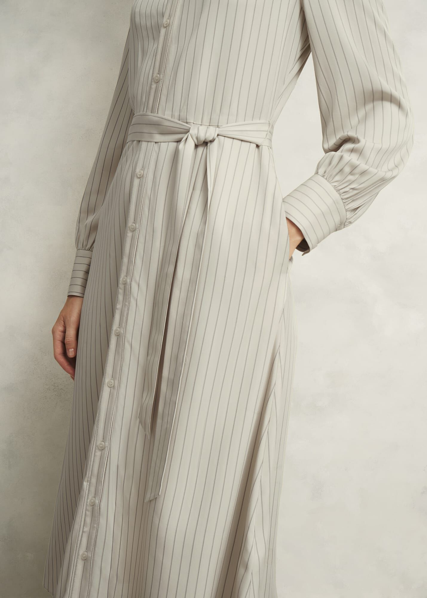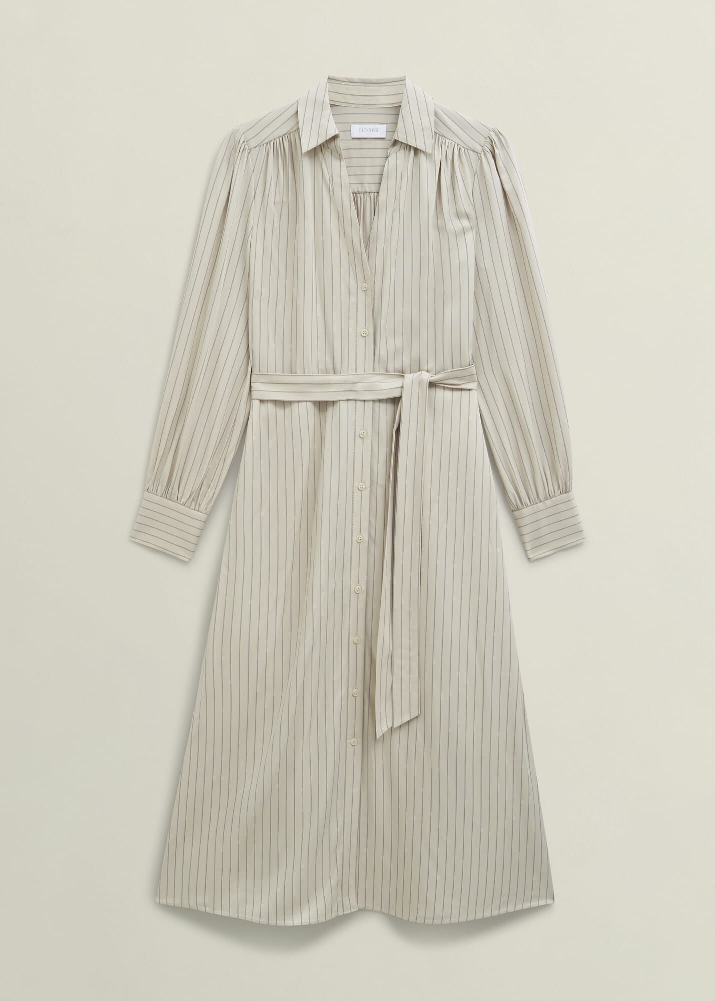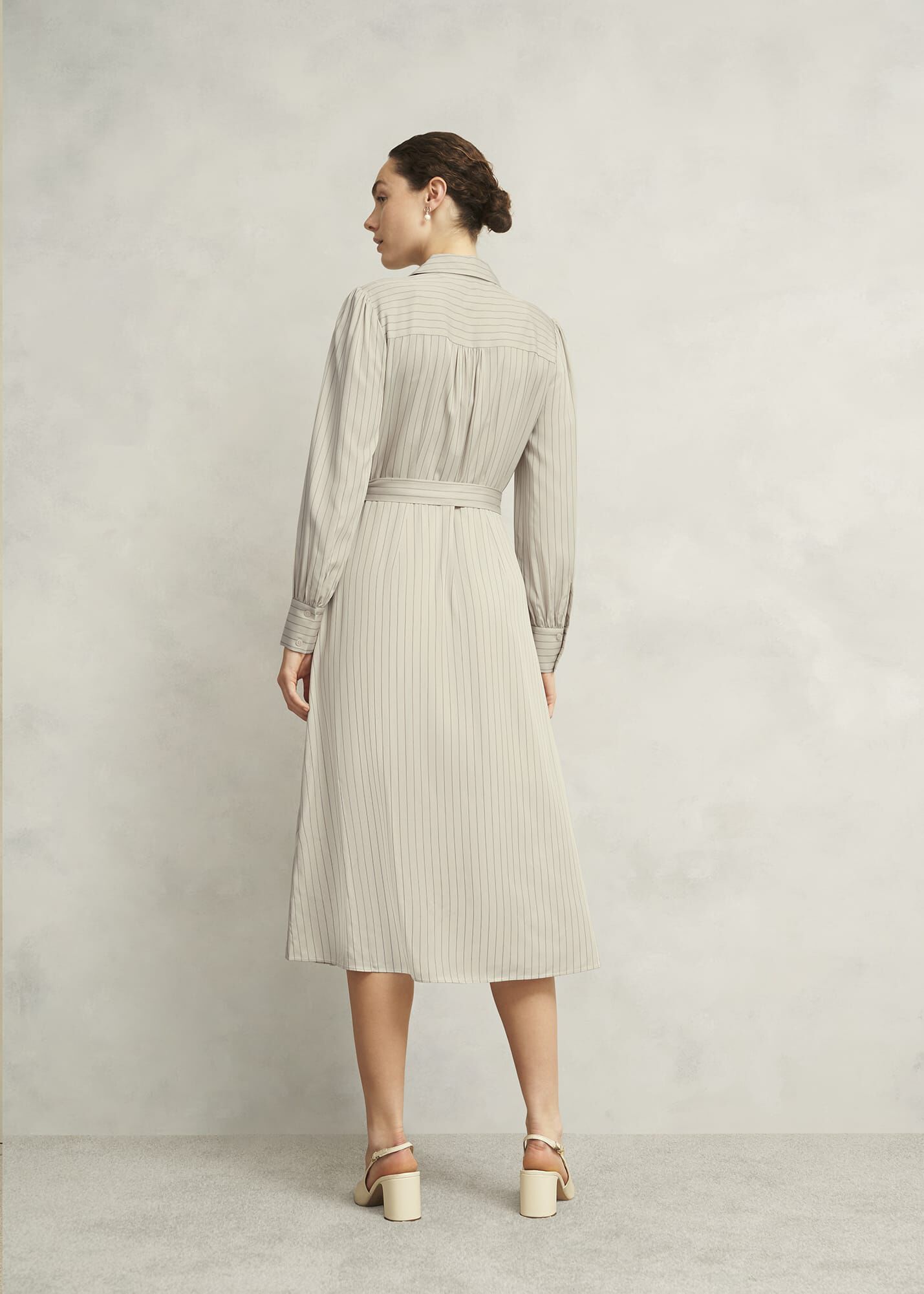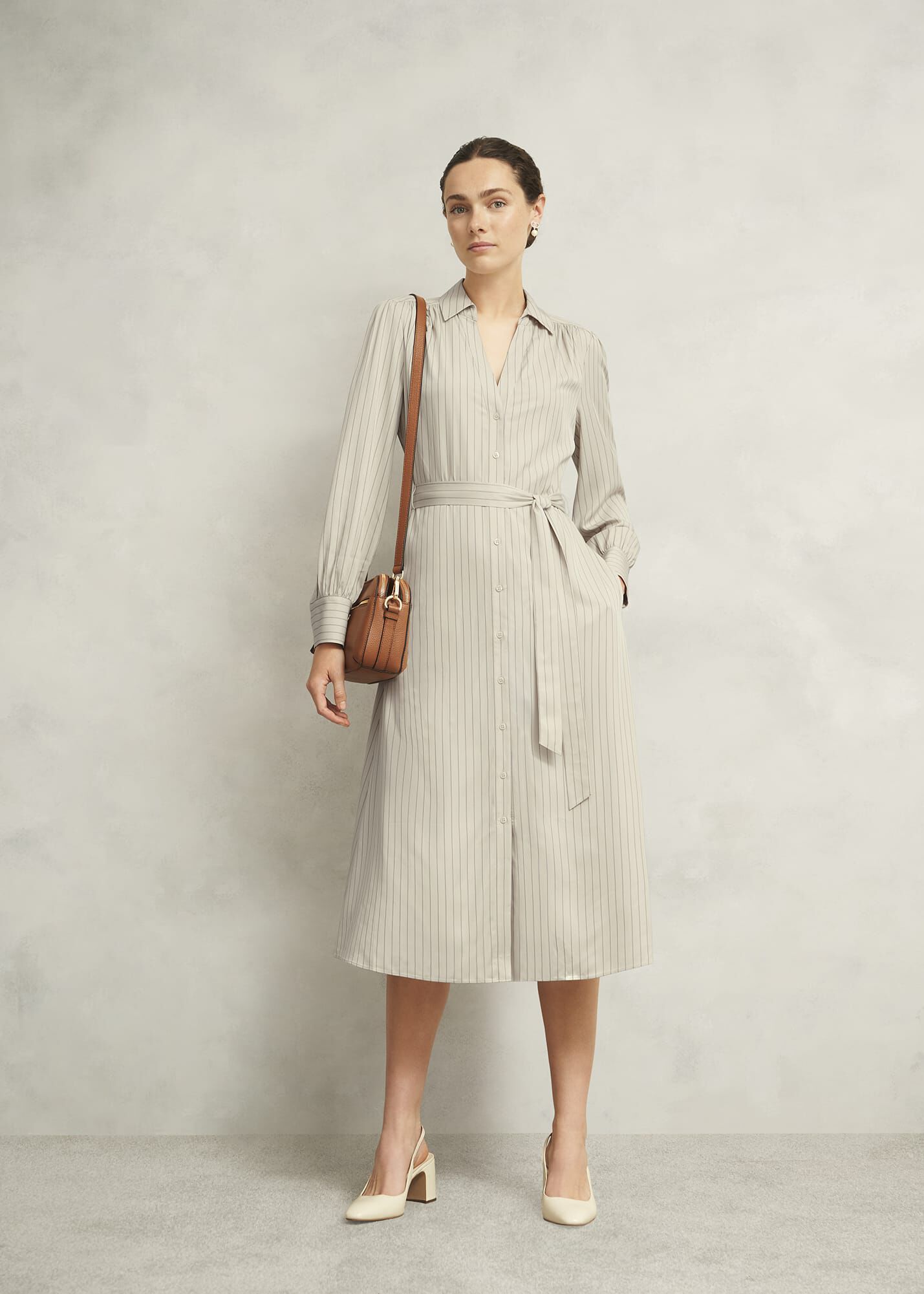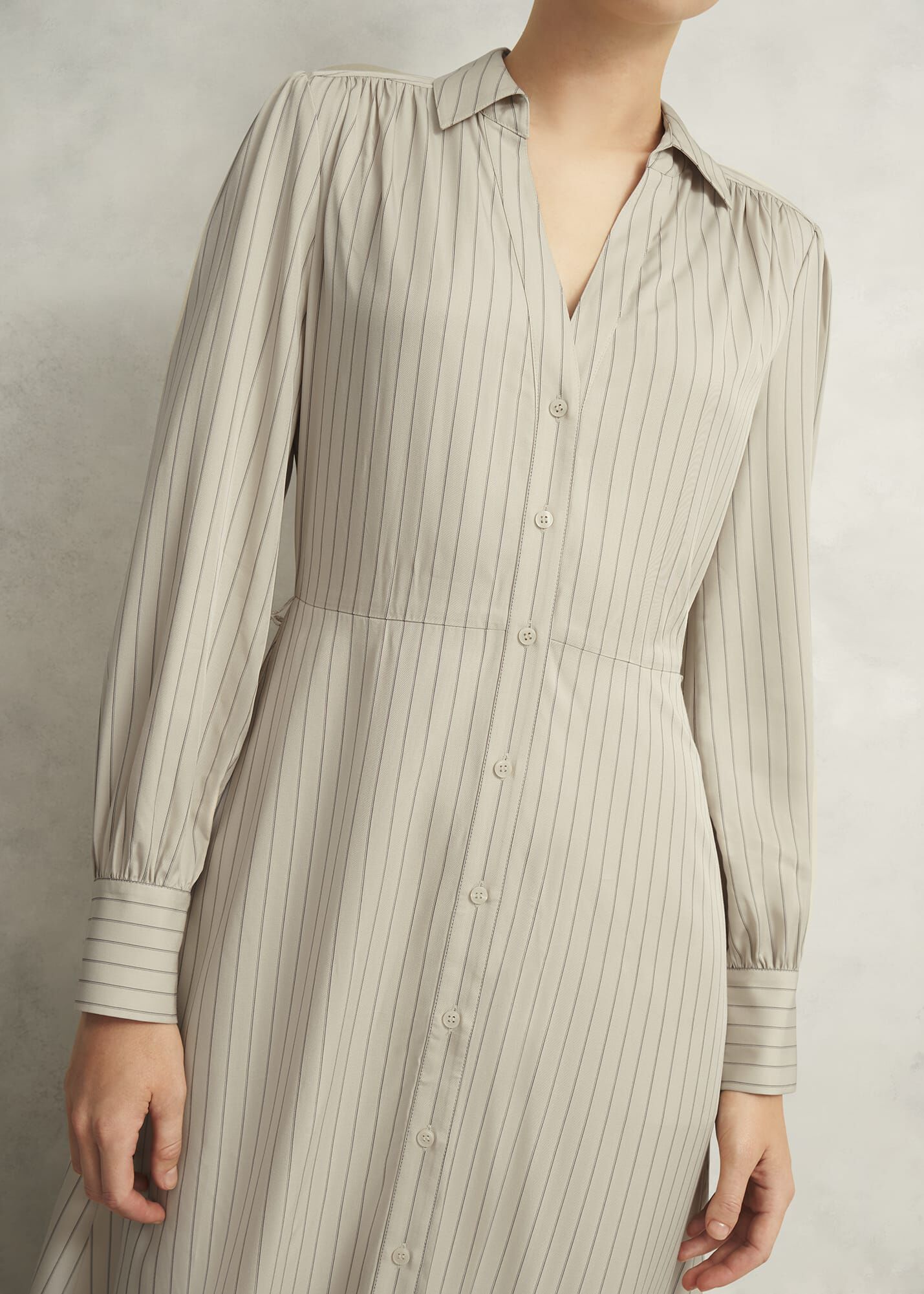 After-work dinner plans? Master AM-to-PM style in neutral pinstripes and shirted accents with the Eleanor dress.